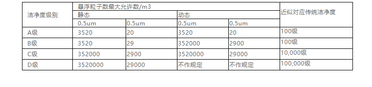 中國GMP(2010年修訂)新版GMP附錄1 無菌藥品.第三章.第九條……潔凈區(qū)各級(jí)別空氣懸浮粒子的標(biāo)準(zhǔn)規(guī)定如下